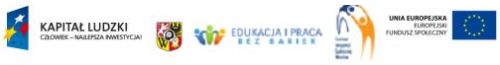 „Edukacja i praca bez barier" jest projektem realizowanym w ramach Programu Operacyjnego Kapitał Ludzki, Priorytet VII. Promocja Integracji Społecznej, Podziałanie 7.2.1 Aktywizacja zawodowa i społeczna osób zagrożonych wykluczeniem społecznym. Jest współfinansowany przez Unię Europejską w ramach Europejskiego Funduszu Społecznego.