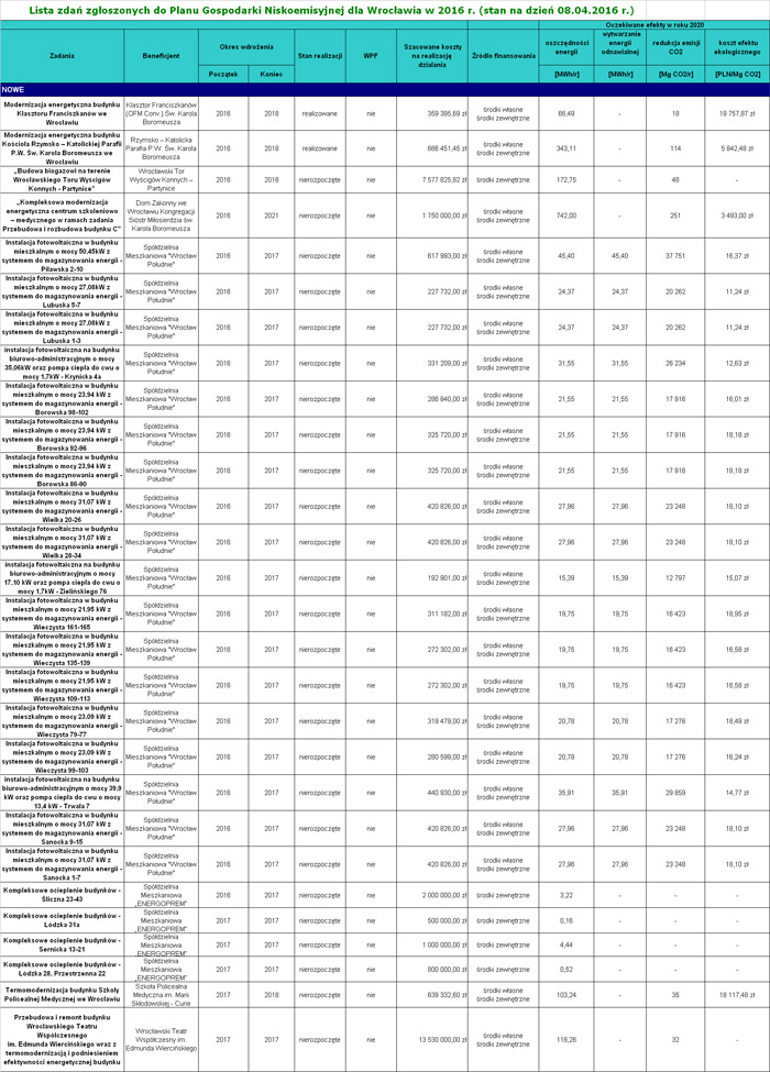 Lista zadań zgłoszonych do Planu Gospodarki Niskoemisyjnej dla Wrocławia w 2016 r. (stan na dzień 8.04.2016 r.)