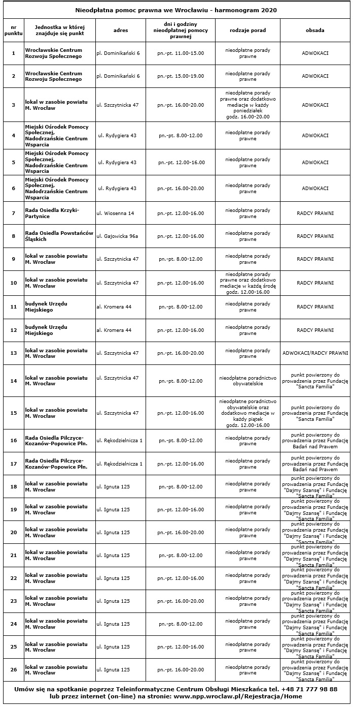 Zgodnie z ustawą z dnia 5 sierpnia 2015 roku - o nieodpłatnej pomocy prawnej, nieodpłatnym poradnictwie obywatelskim oraz edukacji prawnej,  na terenie Miasta Wrocławia od 1 stycznia 2020 r. rozpoczęło działalność 26 punktów, w których udzielana będzie nieodpłatna pomoc prawna, świadczona osobiście przez adwokata lub radcę prawnego, a w szczególnie uzasadnionych przypadkach przez aplikanta adwokackiego lub radcowskiego.