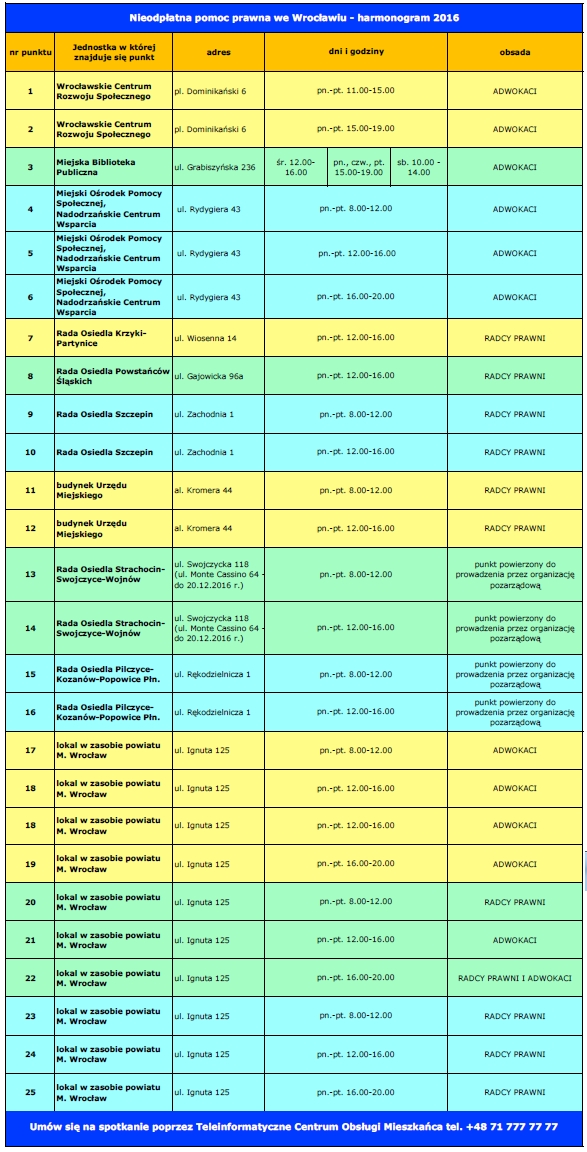 Zgodnie z ustawą z dnia 5 sierpnia 2015 roku o nieodpłatnej pomocy prawnej oraz edukacji prawnej (Dz. U. z 2015 r. poz. 1255), na terenie Miasta Wrocławia od 1 stycznia 2016 r.  rozpoczyna działalność 25 punktów, w których udzielana będzie  nieodpłatna pomoc prawna, świadczona osobiście przez adwokata lub radcę prawnego, a w szczególnie uzasadnionych przypadkach przez aplikanta adwokackiego lub radcowskiego.