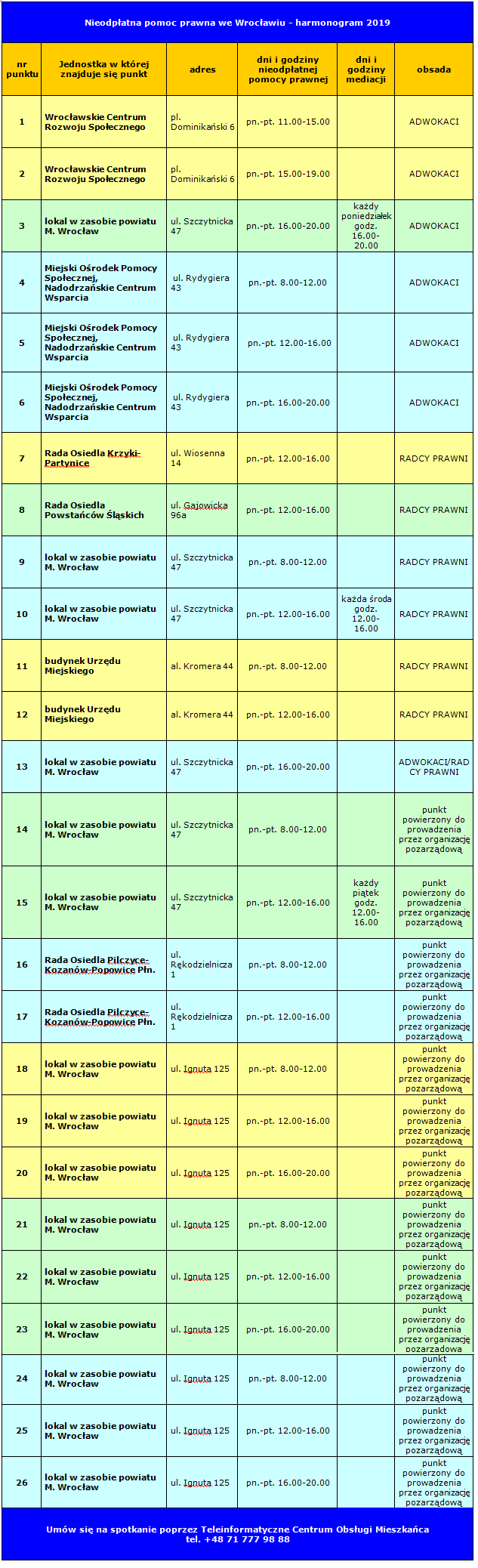 Zgodnie z ustawą z dnia 5 sierpnia 2015 roku o nieodpłatnej pomocy prawnej, nieodpłatnym poradnictwie obywatelskim oraz edukacji prawnej (Dz. U. z 2017 r. poz. 2030, z 2018 r. poz. 1467), na terenie Miasta Wrocławia od 1 stycznia 2019 r. rozpoczęło działalność 26 punktów, w których udzielana będzie nieodpłatna pomoc prawna, świadczona osobiście przez adwokata lub radcę prawnego, a w szczególnie uzasadnionych przypadkach przez aplikanta adwokackiego lub radcowskiego.